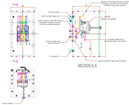 Though each busway design, make or manufacturer evolves their own design of tap off units (both Bolted or Plug-in), plug-in Tap Off units are considered to be most ideal, as these can be plugged out for repair, when & if necessitated, even when the busway is live, retaining power without disturbing other load points. DELTABAR has evolved unique tap-off units, with standardized design & frame size, thereby ensuring utmost reliability and efficiency in power collection, irrespective of the magnitude of the current rating.